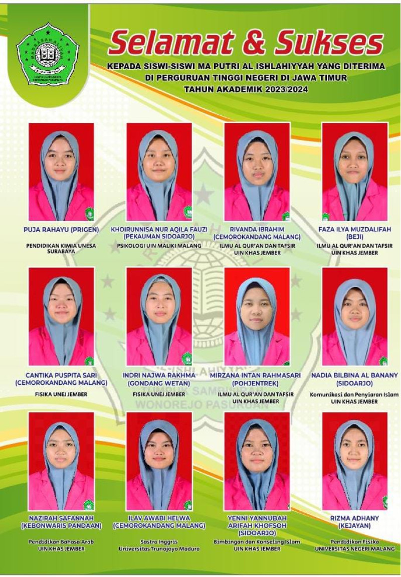 Alhamdulillah sebanyak 12 Siswi MA Putri Al Ishlahiyyah kelas XII TP 2022-2023 yang diterima kuliah  di Perguruan Tinggi Negeri  (PTN) melalui program beasiswa (gratis). Ini adalah hasil yang memuaskan dan membahagiakan. Karena  tahun pelajaran 2021-2022 yang  lalu yang diterima di Perguruan Tinggi Negerii  ( PTN ) adalah sebanyak 5 (lima) siswi.